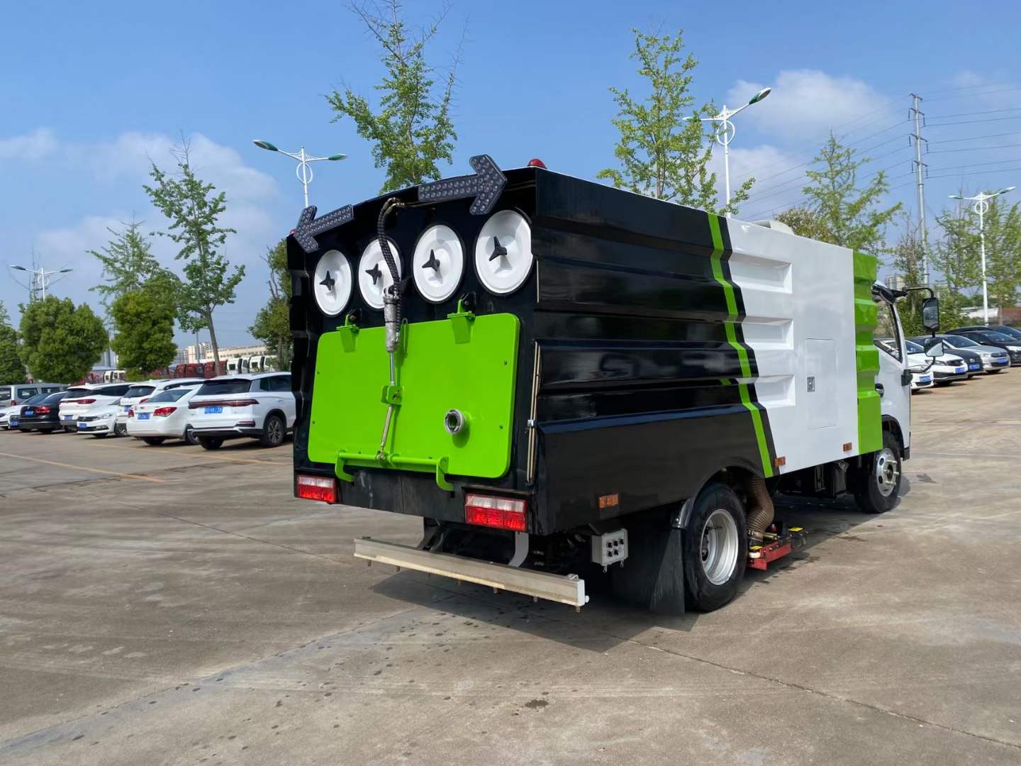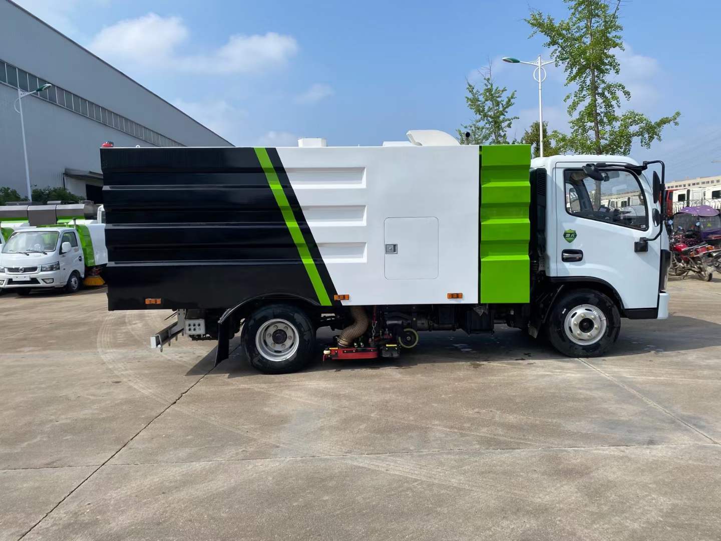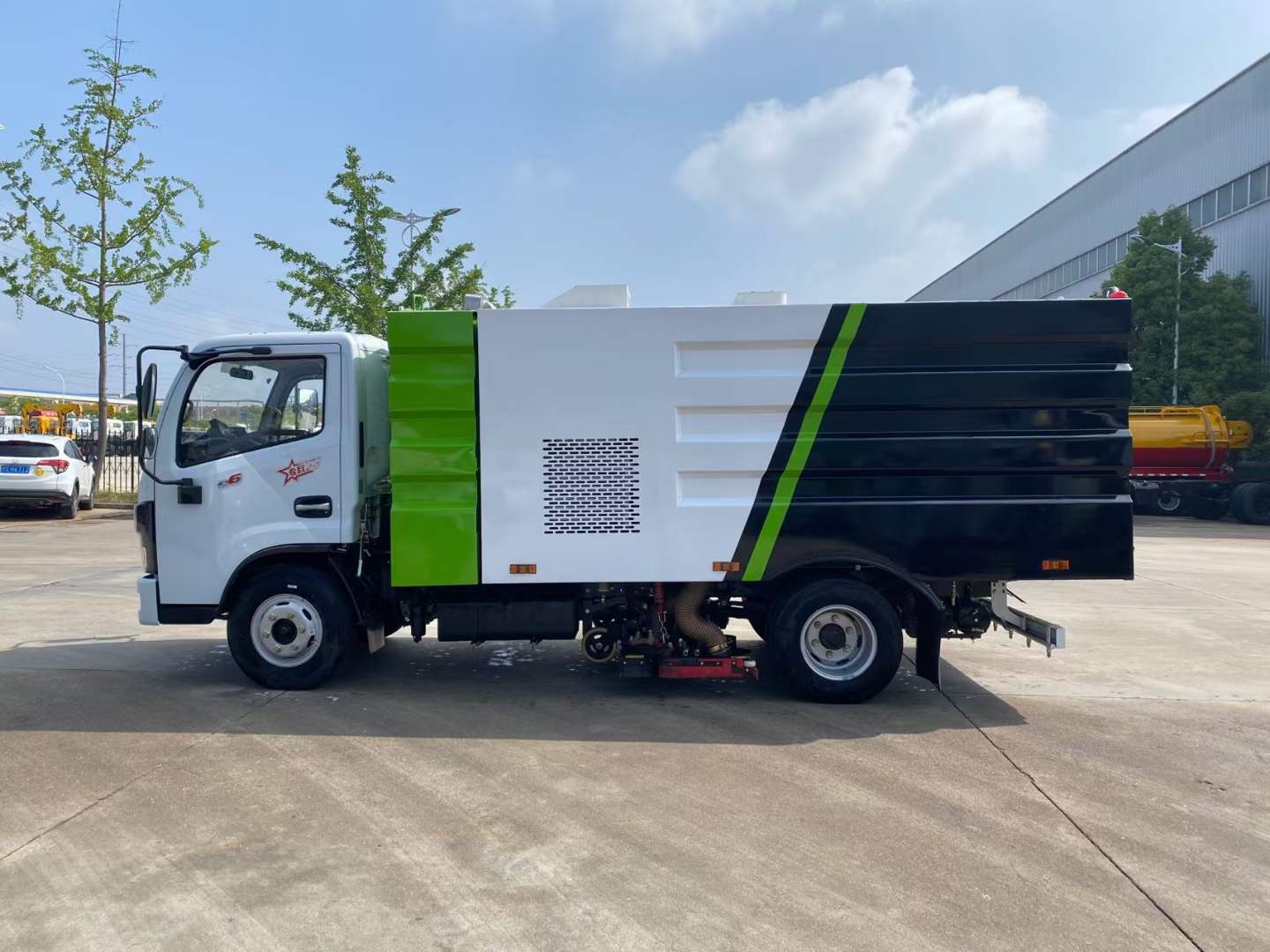 隨底盤選裝駕駛室;選裝后部結(jié)構(gòu)樣式.僅采用3308mm軸距;側(cè)防護(hù)由專用裝置吸盤代替;后防護(hù)材料Q235,焊接連接,后部防護(hù)斷面尺寸(mm):120×50,離地高度(mm):400;ABS型號(hào)/廠家:ABS/ASR-12V-4S/4M/襄陽(yáng)東風(fēng)隆誠(chéng)機(jī)械有限責(zé)任公司;該車主要由箱體和吸塵裝置組成,用于路面垃圾清掃.