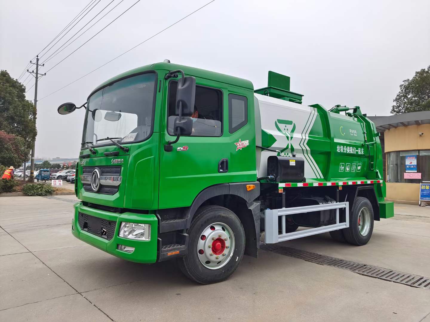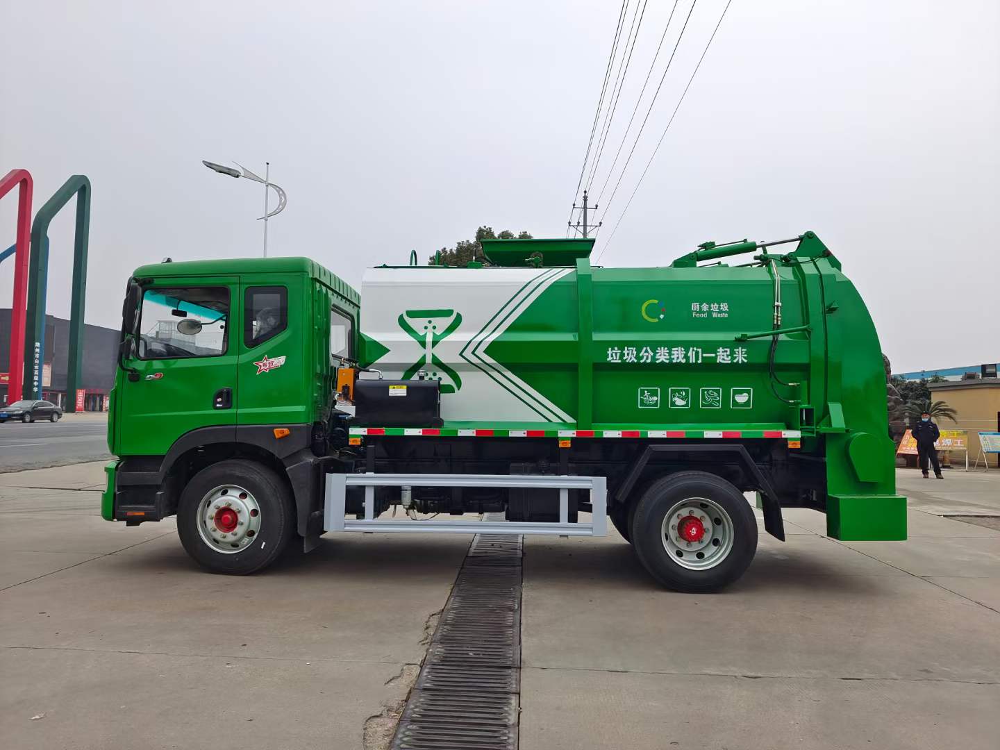 1、外觀造型美觀大方:垃圾箱橫向截面為方型框架、縱向截面為矩型框架,兩側及頂面均為圓弧造型,整車顯得美觀大方;