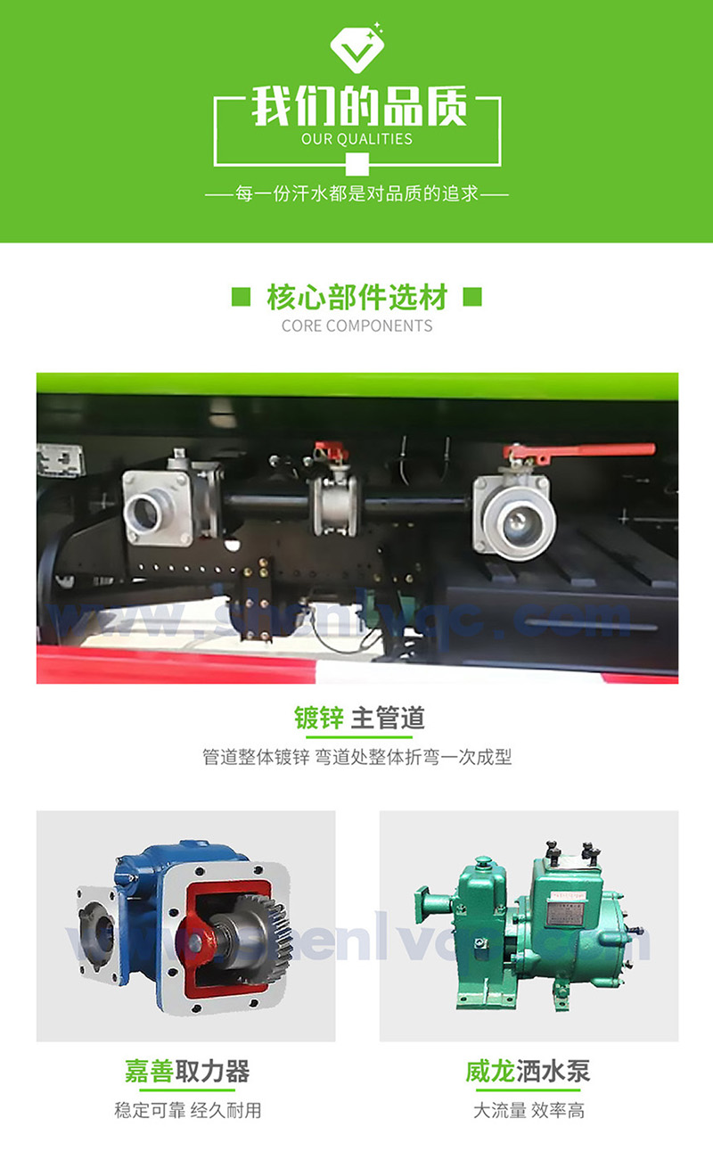 前沖、后灑、側(cè)噴、后平臺(tái)高炮、自流閥、消防接頭、濾網(wǎng)、噴頭、帶自吸自排、全功率取力器、音樂喇叭 |