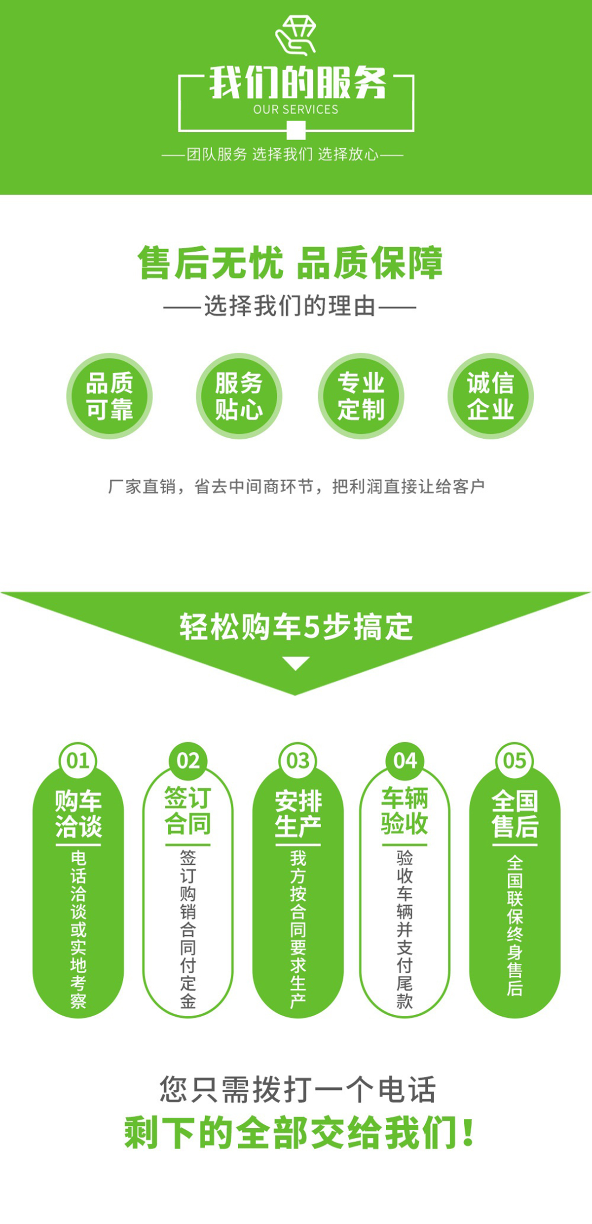·創優質服務企業; 造用戶滿意產品; 樹國內知名品牌!公司堅持以“質量求生存、信譽求發展、科技創新路、服務創品牌”的經營理念,以“誠信、務實、創新、進取”為企業宗旨,不斷提升自身產品質量,開發適應市場需求物美價廉的多功能專用汽車! 我們將謁誠為您提供更好、更快、更優質的服務!